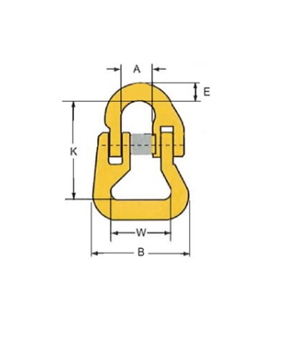 | Stock No. | WLL ( ton ) | For Chain ø ( mm ) | W ( mm ) | B ( mm ) | A ( mm ) | K ( mm ) | E ( mm ) | Weight ( kg ) |